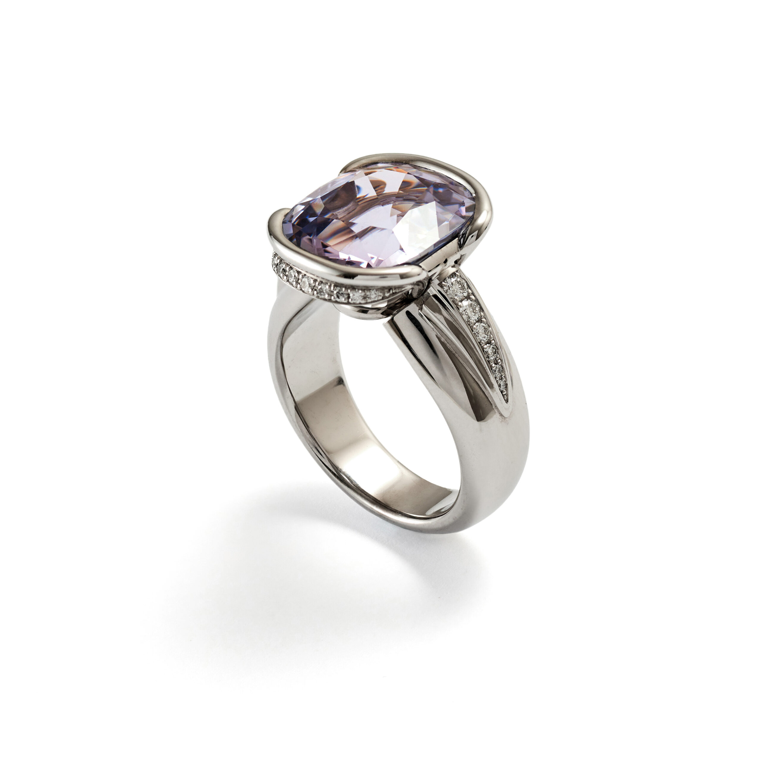 - Edelstein Angaben1 Spinell, 10.28 ct, im Brillant-Treppenschliff, Form: Antik , 13.6 x 12.3 mm. 30 Brillanten Total 0.25ct F-G/VS